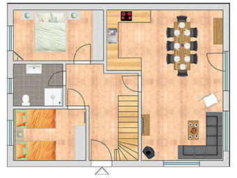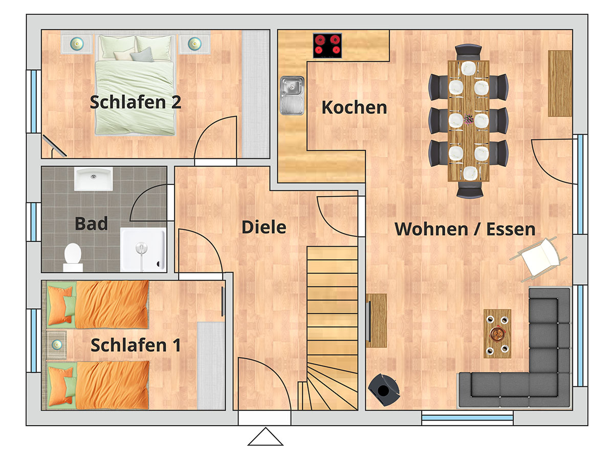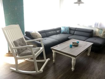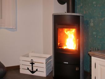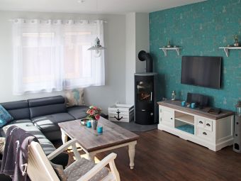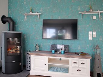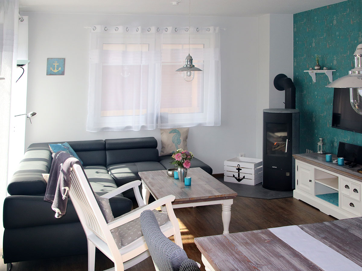 Im Wohnbereich spendet ein Kaminofen wohlige Wärme und das gemütliche Ecksofa lädt Sie zum Chillen ein.