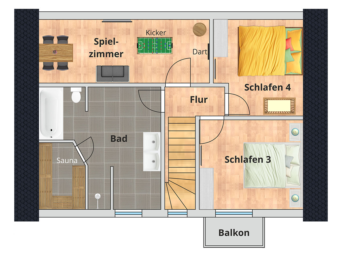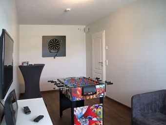 Ein extra Highlight ist das Spielezimmer mit SmartTV, Playstation, Multifunktionsspieltisch, Dartscheibe und Spiele für die kleinen Gäste. Luxus für die ganze Familie - auch bei schlechtem Wetter!