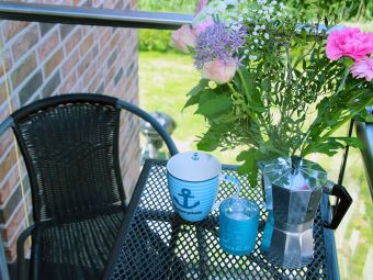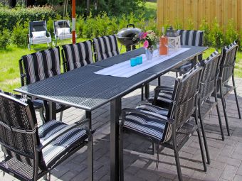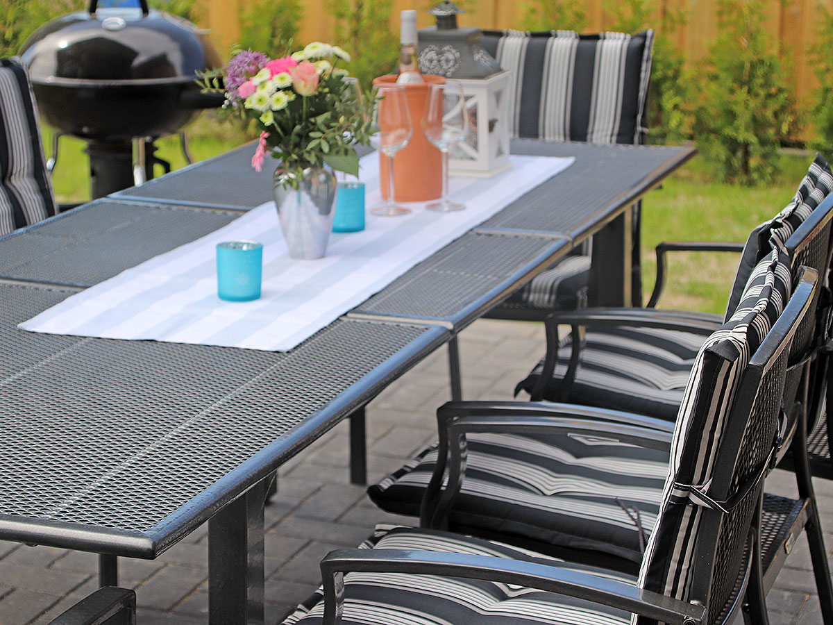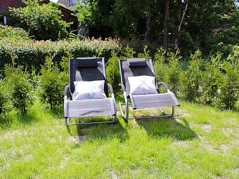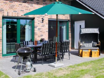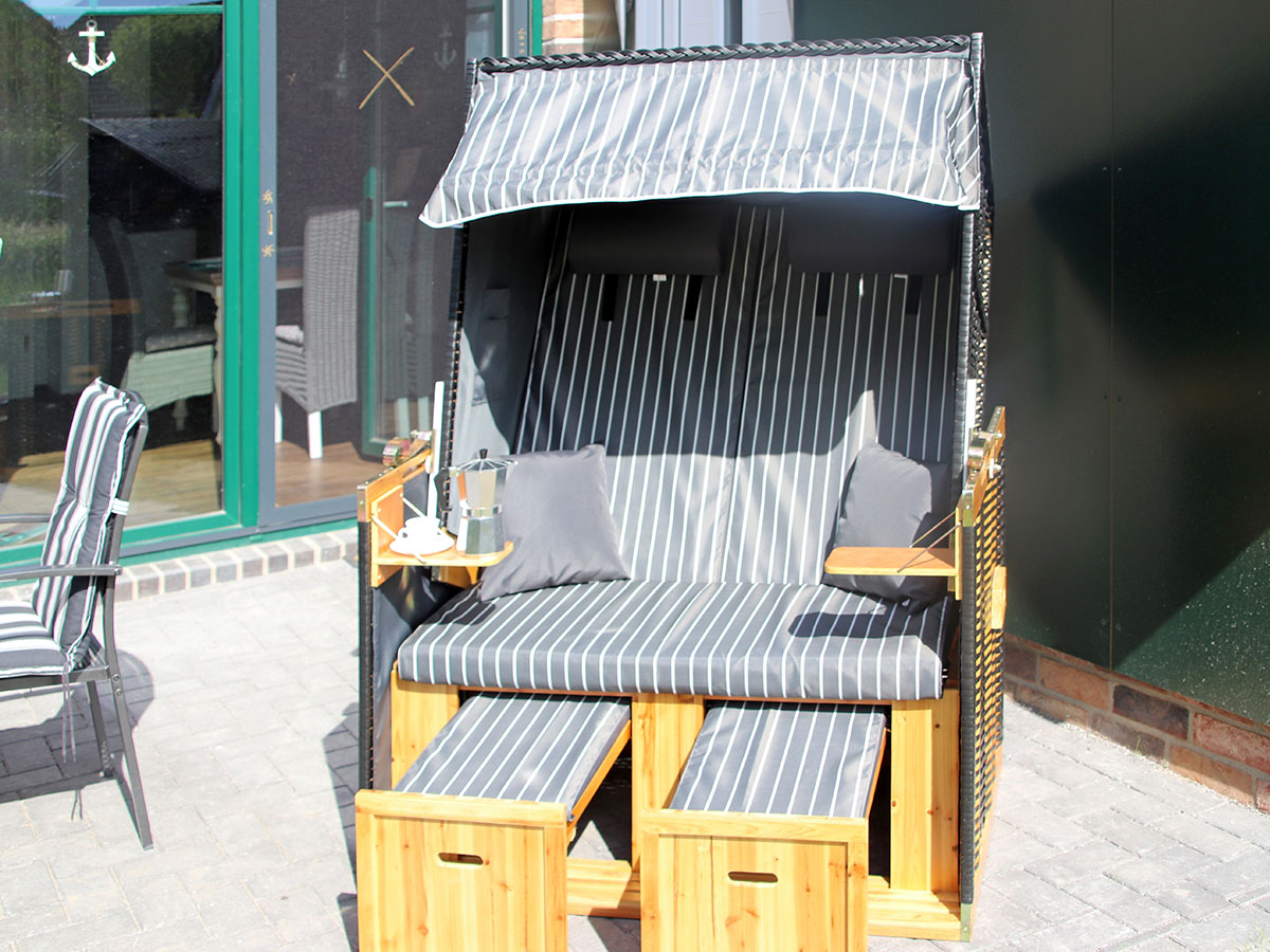 Der Garten bietet zwei Schaukelliegen, einen Strandkorb sowie Terrassenmöbel und einen Holzkohlegrill. Der Abstellraum verfügt über eine Waschmaschine und einen Wäschetrockner, die Sie gegen Gebühr nutzen können. |