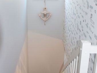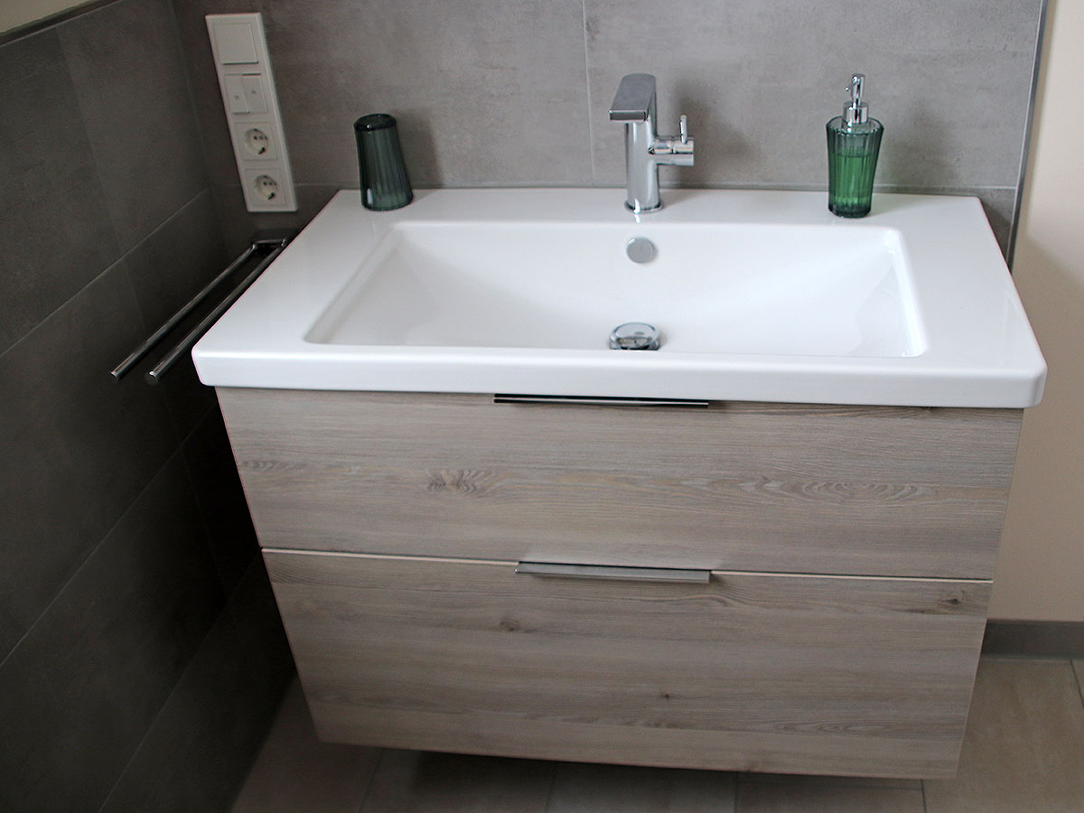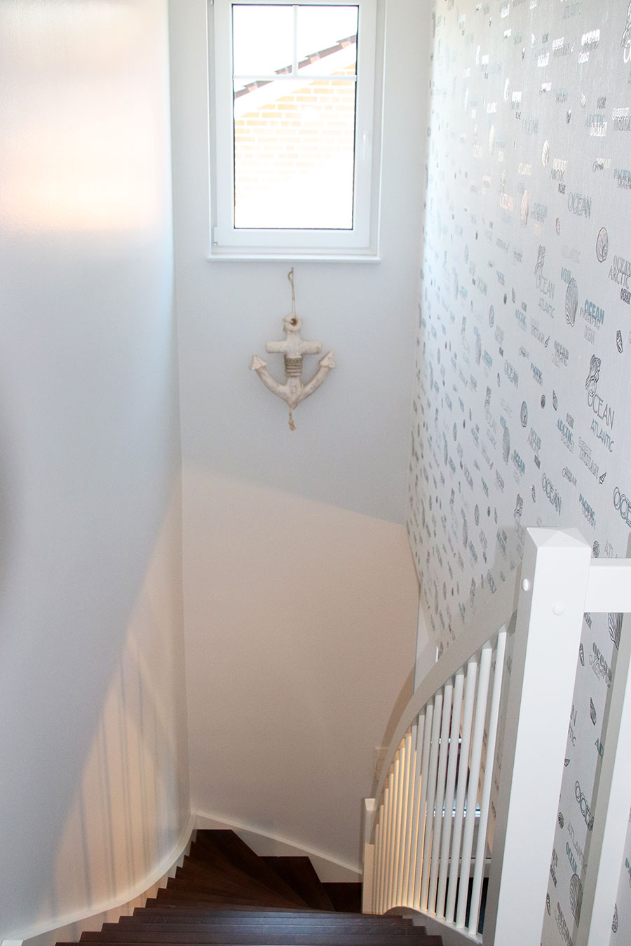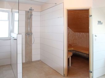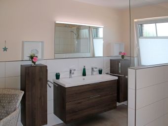 Im OG finden Sie ein tageslichthelles, Wellnessbad mit Sauna, Whirlpool, Rainshower Dusche, WC und Doppelwaschtisch sowie hochwertige Burg-Badezimmermöbel. Der Treppenbereich ist durch ein Treppengitter geschützt. Ein zweites Bad mit Tageslicht und ebenfalls Rainshower Dusche finden Sie im EG.