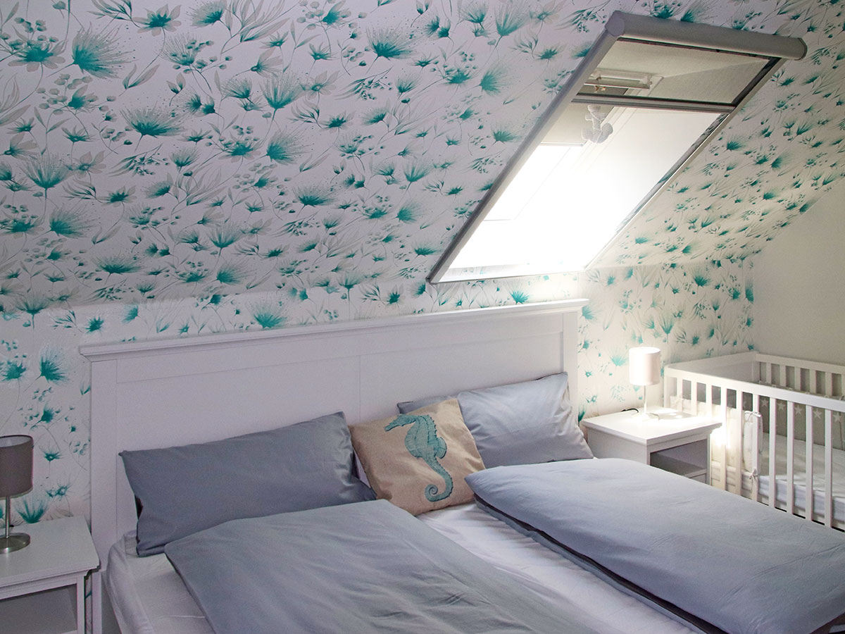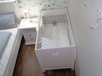 In einem Schlafzimmer befindet sich ein Holzbabybett für unsere kleinsten Gäste.